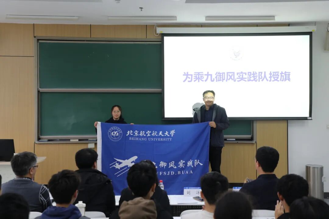 校团委书记刘洋为乘九御风实践队新任队长王馨悦授队旗,象征着乘九御风实践队正式开始寒假社会实践的筹备工作。