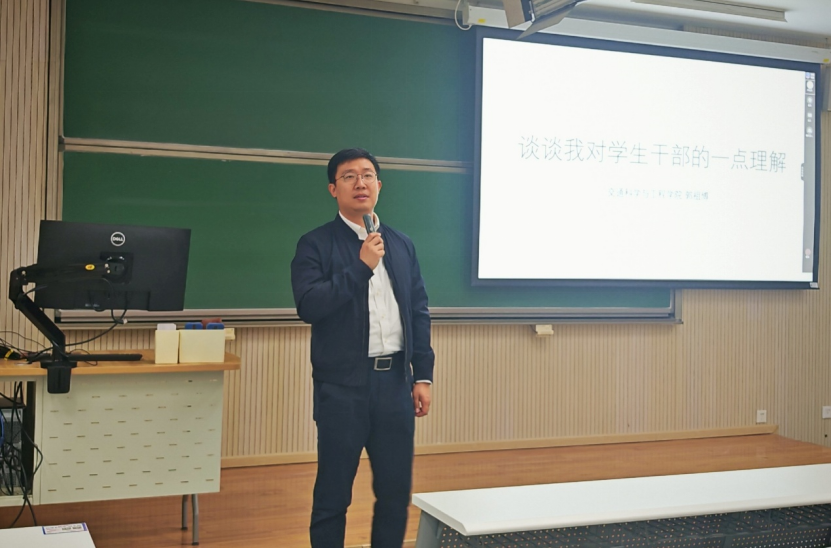 随后,郭老师结合个人在北航学习工作的成长经历,从“德、知、情、行”四个维度展开,阐述了自己对于一名学生干部应具备基本素养的理解,指出大家应注重提升个人认知的维度、高度、广度,学会复盘与换位思考,在实践中辩证看待说与做、快与慢、舍与得、危与机、时与势等几组关系,养成良好的工作素养。他以在校工作期间几段真实经验为例,分享了如何高效建设团队、推进工作、调整心态、激发创新与活力、确保工作成果质量,强调了解决复杂矛盾问题的关键在于“情绪分割、本质剖析、各个突破”。他勉励全体学员,在工作中要“耐得住孤独、扛得起担子”,将“10000小时定律”融入日常,在持续积累中实现能力素养的跃升,不断提升思辨能力与解决实际问题的本领。